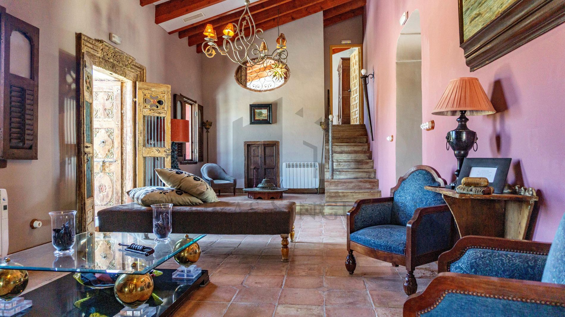 On the outside, the building presents an attractive picture, with its facades painted in a spectacular Veronese red color, which contrasts with the ocher tones of the terraces and porches that surround it, with the intense blue of the pool located in front of the main façade. and with the green of the ornamental plants arranged in the garden area.