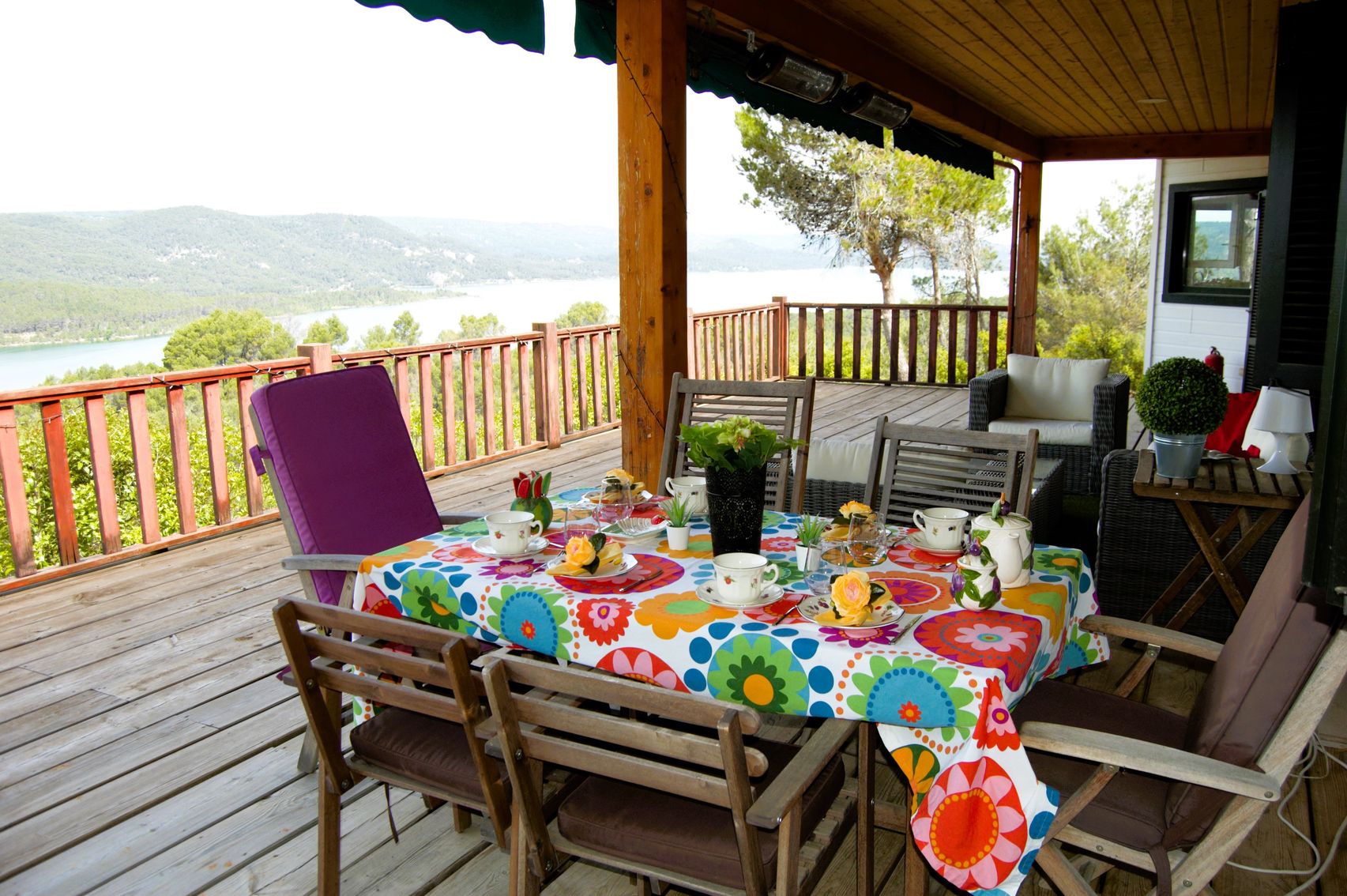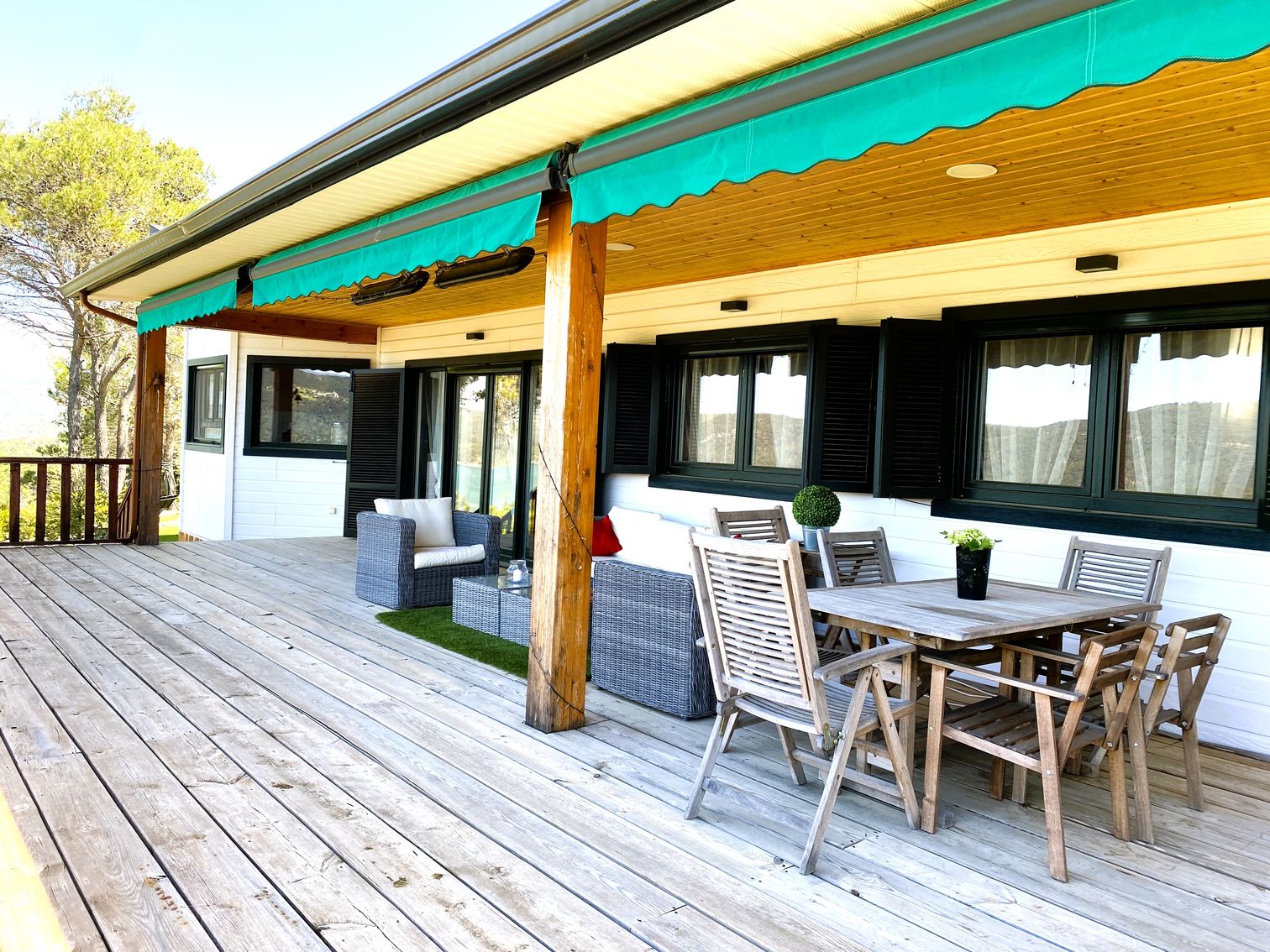 En el exterior, la agradable terraza con porche de madera continúa ofreciendo una excelente panorámica del privilegiado entorno natural que ofrece Entrepeñas, el jardín se ha diseñado en varios niveles que albergan una piscina, zona de barbacoa y frontón; cuenta con cuatro sistemas de riego automático independientes.