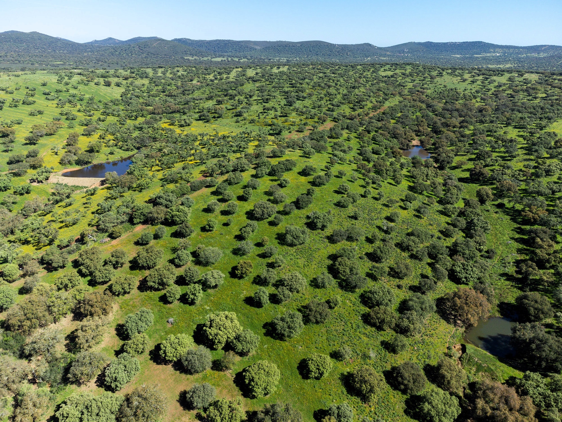 La finca dispone de una extensión de 920 hectáreas de terreno con aproximadamente 70% de dehesa limpia con un gran número de encinas y alcornoques y 30% de monte mediterráneo con lentisco, acebuches y madroños.