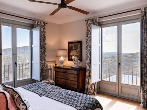 Su magnífica casa señorial, construida en 2018, ha sido diseñada como los cortijos tradicionales que antaño presidían estas grandes dehesas extremeñas. Cuenta con 1.250 m² construidos en los que se han utilizado materiales nobles como la piedra y la madera, combinados con elementos de decoración actuales de excelente calidad y diseño rústico.