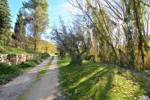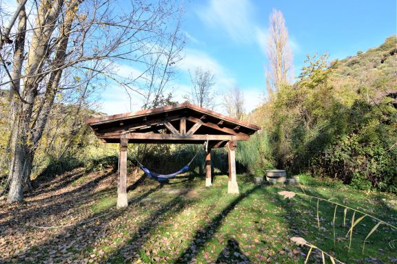 La construcción está situada en una preciosa finca de 15.675 m² atravesada por un arroyo con caudal todo el año que forma, dentro de la finca, un pequeño estanque acondicionado para el baño y pequeños saltos de agua. El terreno cuenta con grandes árboles de ribera como álamos y otras especies autóctonas.