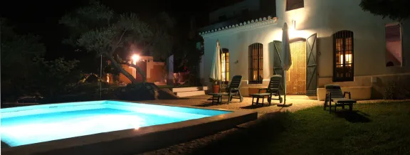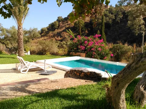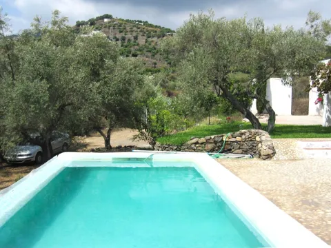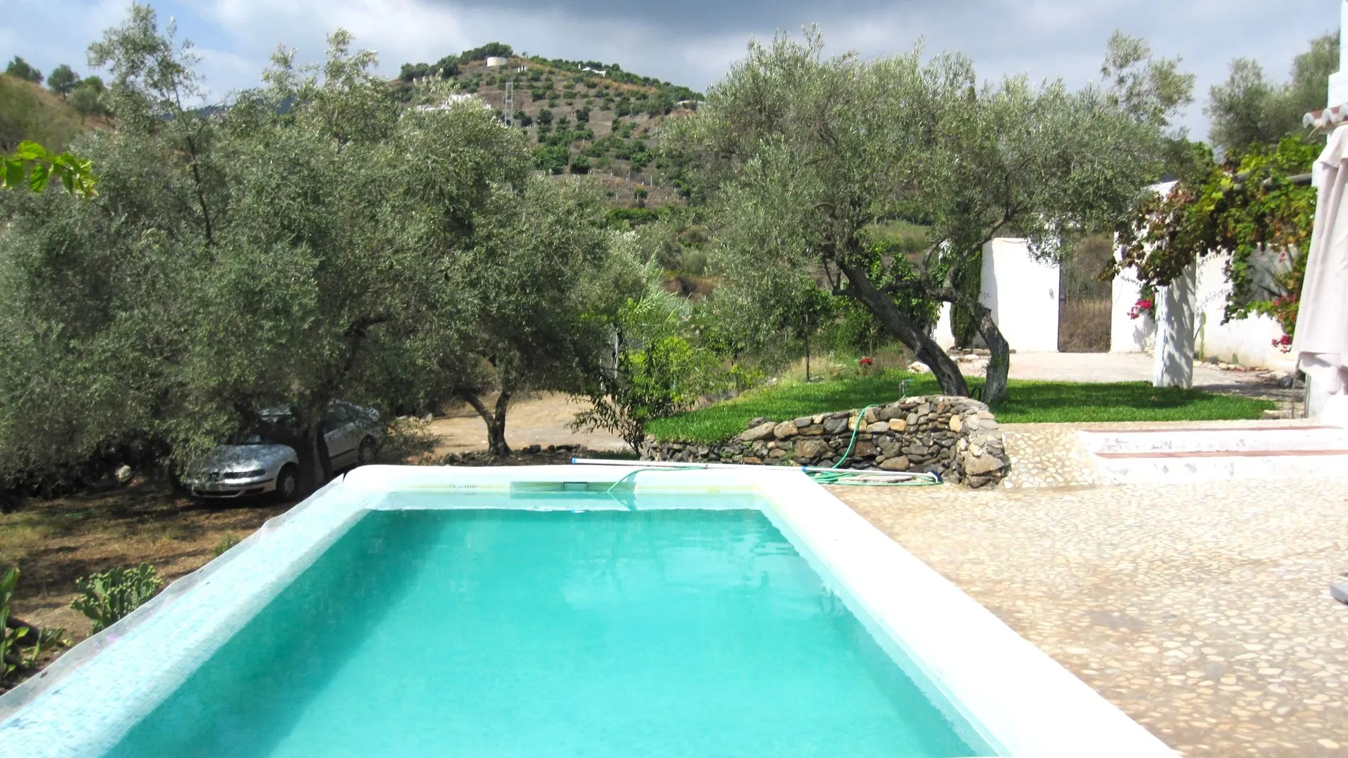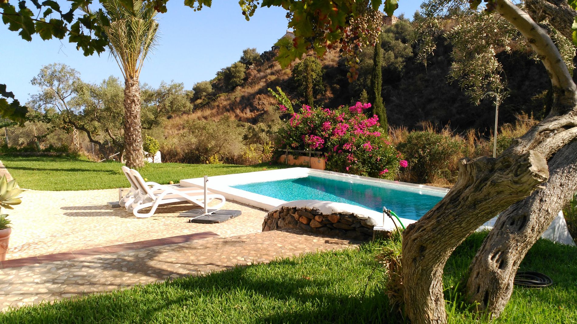 La finca, con una superficie catastral de 3.500 m², acoge una cuidada zona ajardinada que rodea las viviendas y una plantación de olivos y frutales que realza el carácter rural de la propiedad. En el área exterior destaca una piscina de 21 m², perfecta para disfrutar del clima suave de la Costa del Sol oriental.